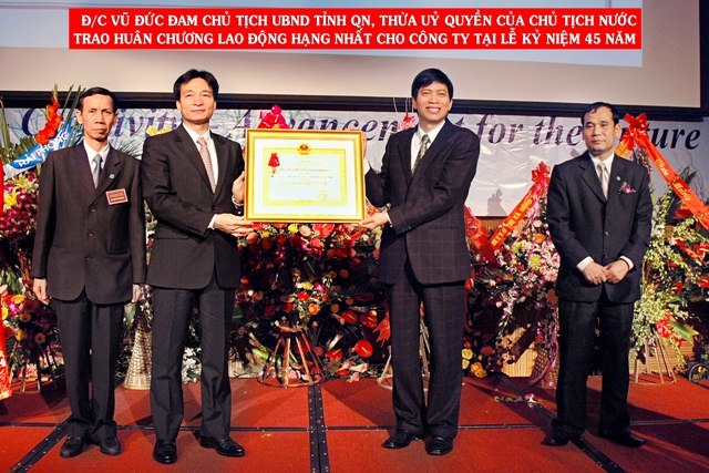 Đ/c Vũ Đức Đam chủ tịch UBND Tỉnh Quảng Ninh, thừa quyền Chủ tịch nước trao Huân chương Lao động Hạng nhất cho Công ty tại lễ kỷ niện 45 năm.