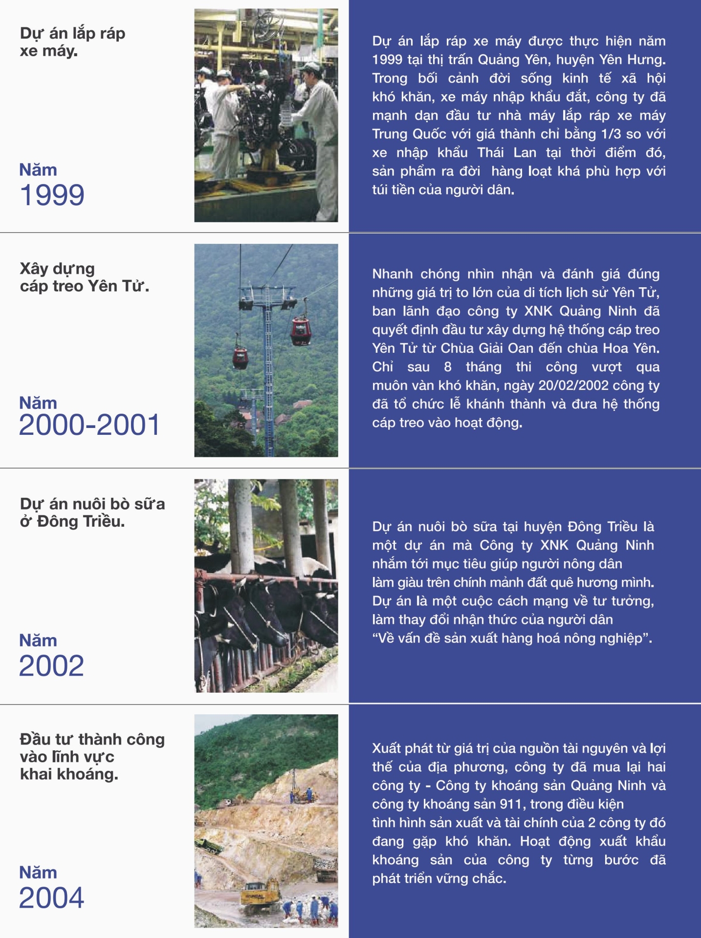 Dự án lắp ráp xe máy được thực hiện năm 1999 tại thị trấn Quảng Yên, huyện Yên Hưng là sự kiện mở đầu, đánh dấu một bước ngoặt về chuyển đổi mô hình sản xuất, từ việc kinh doanh TM - XNK đơn thuần sang lĩnh vực sản xuất hàng hoá của QUNIMEX. Trong bối cảnh đời sống kinh tế xã hội khó khăn, xe máy nhập khẩu đắt. Công ty đã mạnh dạn đầu tư nhà máy lắp ráp xe máy Trung Quốc với giá thành chỉ bằng 1/3 so với xe nhập khẩu Thái Lan tại thời điểm đó, sản phẩm ra đời hàng loạt khá phù hợp với túi tiền của người dân. Dự án đã mang lại lợi nhuận lớn cho doanh nghiệp và còn tạo thuận lợi không nhỏ cải thiện việc đi lại cho người dân và giải quyết nhiều việc làm cho người lao động tại địa bàn Yên Hưng.